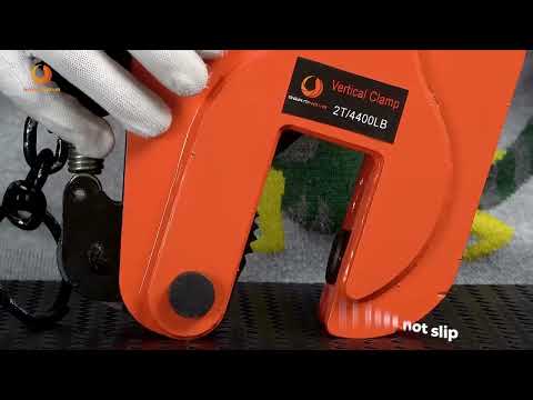 За да работите с Лапа за ламарина вертикална HPL трябва да издърпате пръстена, за да отворите приспособлението, разхлабете челюстта от куката, затегнете стоманената плоча в отвора и след това дръпнете назад пружината, за да заключите.